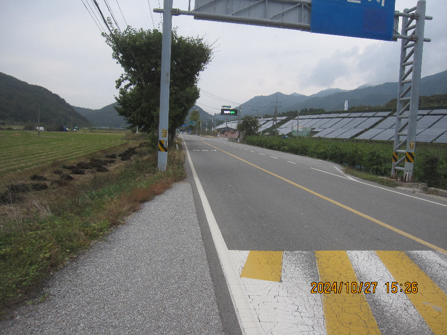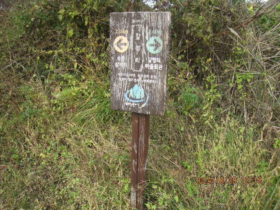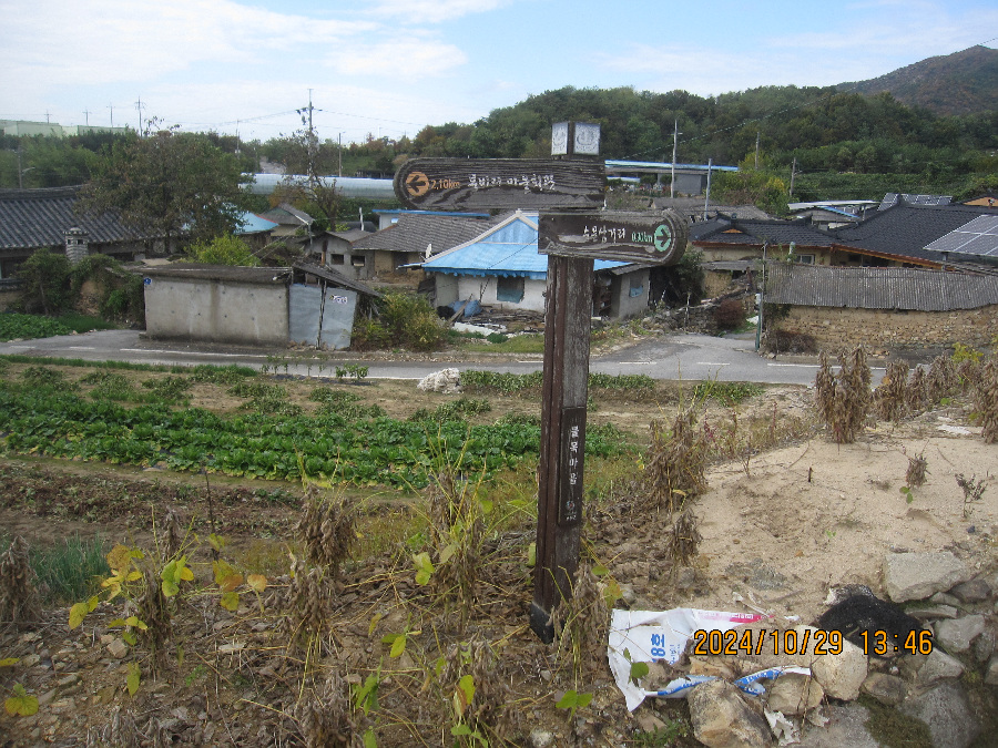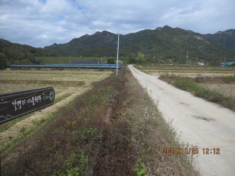 마을 끝에는 갈평 저수지 뚝이 보이고 이정표도 자주 등장