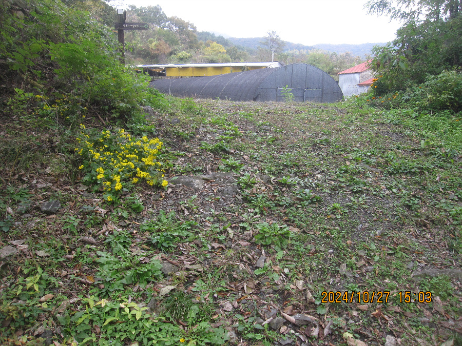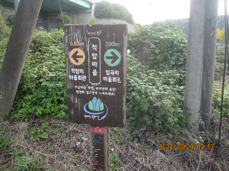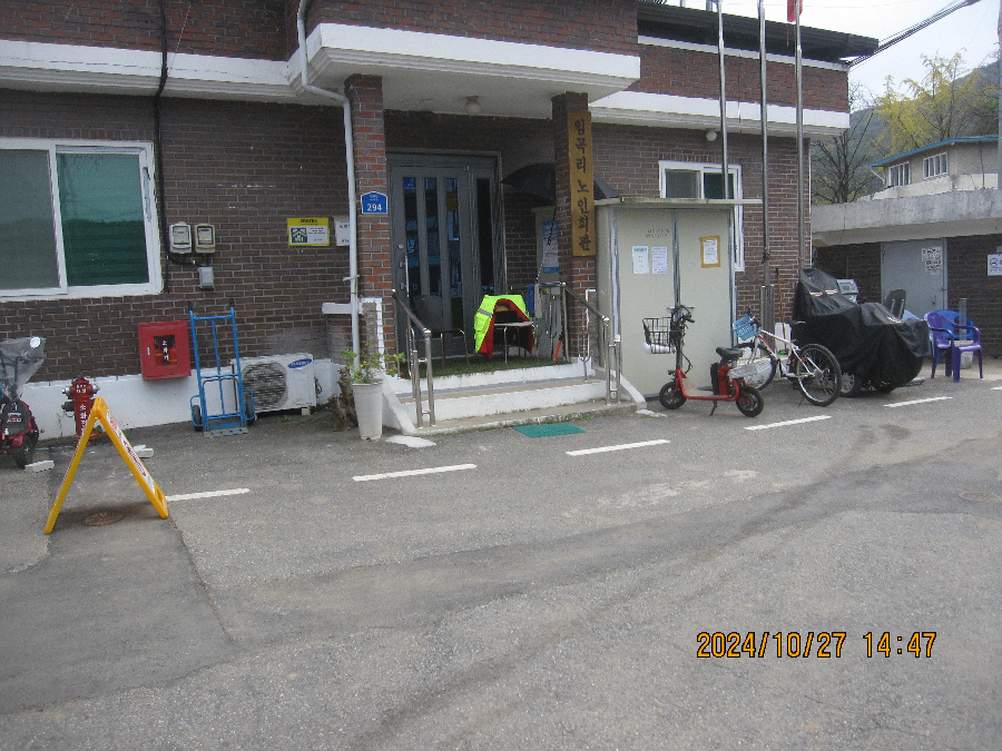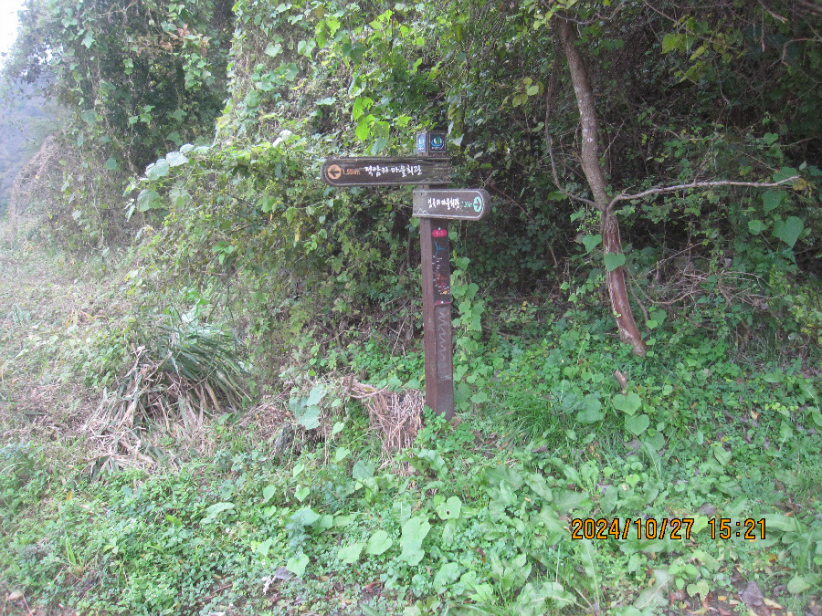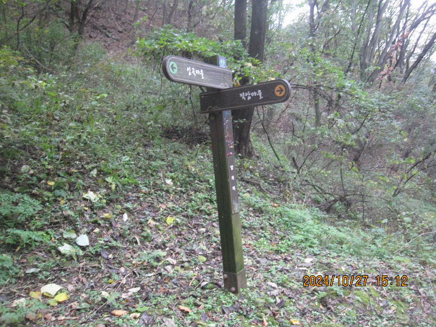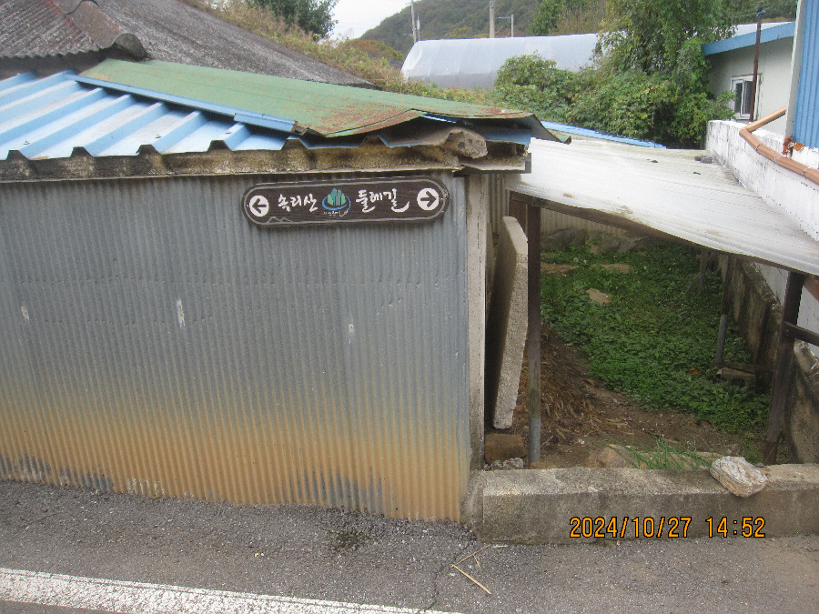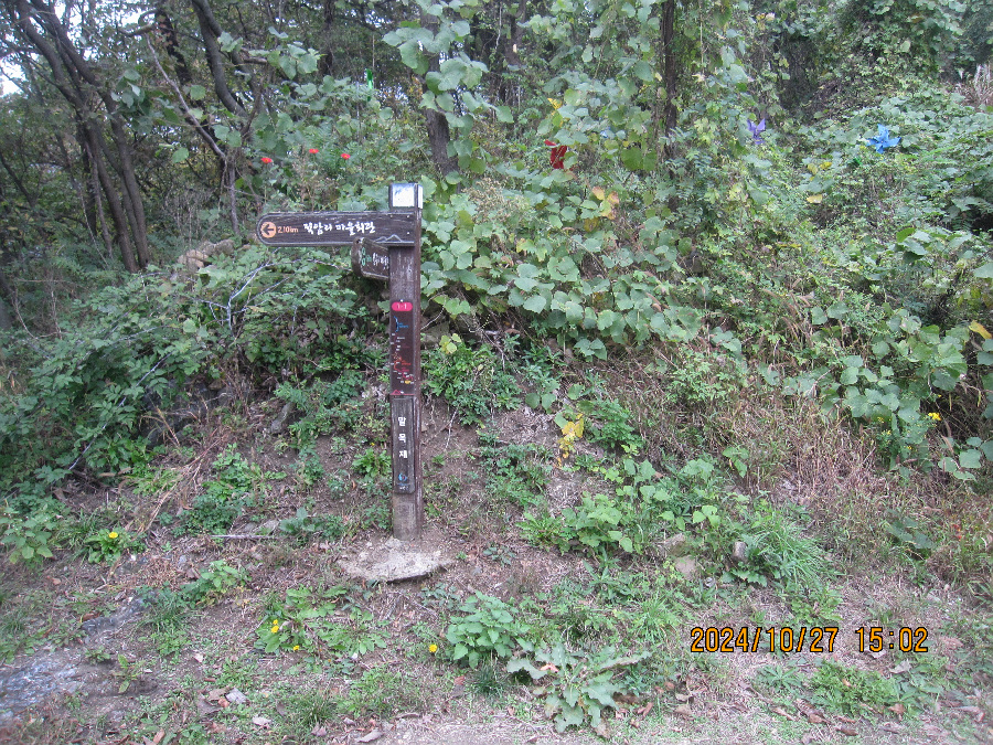 적암 마을회관이 아래있고 경노당이 마을 안 사기막 경계에 존재 여기서 좌측인 서쪽으로 갑니다. 신선대로가는 마지막 동네 사기막 마을을 눈아래 보고 촬영합니다. 이건물을 끼고 이정표 서쪽 방향으로 오릅니다.