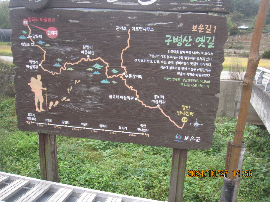 * 이동구간 : 속리산 둘레길, 구병산 옛길 1구간(임곡리-적암리-갈평리-수문리-불목리-봉비리 등 구병산 아래 멋진동네를 가로질러 이동)