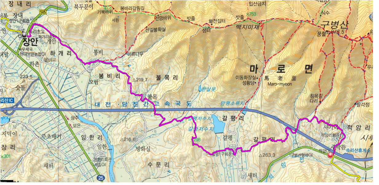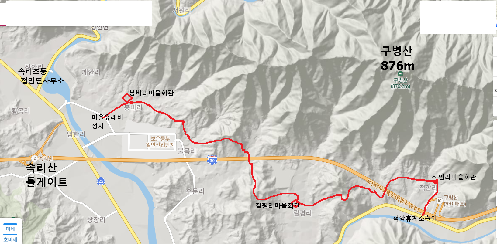 아래 그림은 구병산 옛길 1구간 답사로 오늘 이동한 적암휴게소에서-봉비리 마을회관까지 이동한 구간을 표시함-봉비리서 속리초등앞까지는 체력저조로 미답이라 다음기회에 봉비리마을회관에서 속리초등 근방까지 이동 예정임
