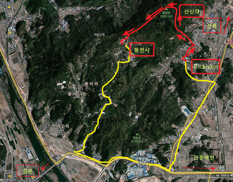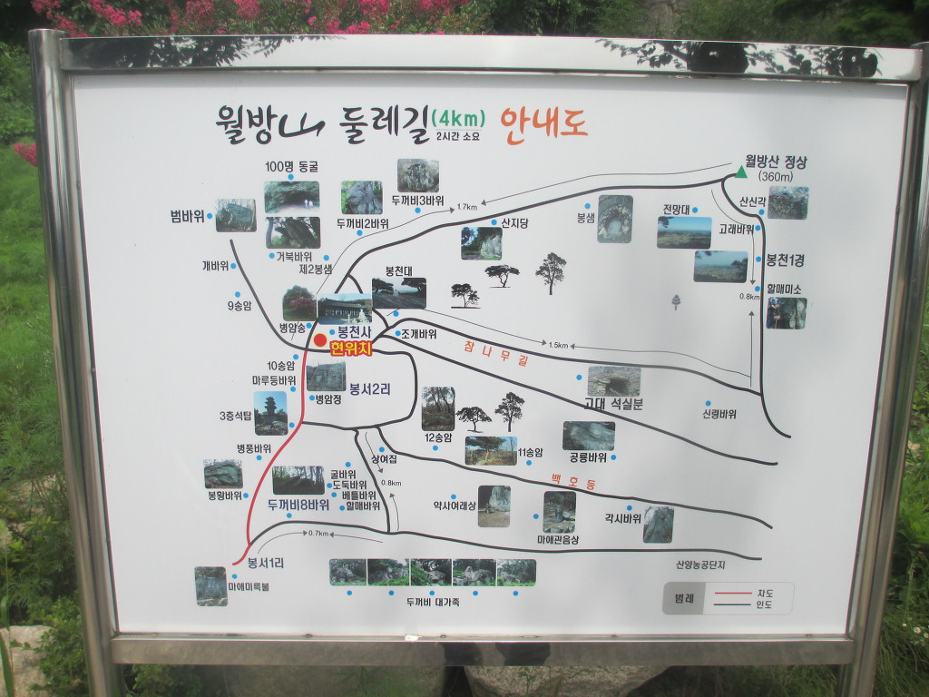 느티나무에 쉬고있는 할머니에게 월병산 등산로를 설명듣고 동네 중턱에 주차하고 200미터 언덕위 별장이 있는 고개서 좌틀하니 등산로다. 바로 내려가면 봉정 2리이다. 풀이 우거져 길이 험하다가 산속 나무밑에가니 낙엽양탄자길이다. 여기서부터 급사면이다.고개를 처다보니 감감하다. 30미터씩 10번을 쉬어가는 걔획으로 헉헉대며 쉬다가 오르기를 반복한다. 중턱에 오르니 봉천사 스님이 설치한 이정표가 나타나기 시작한다. 자세한 설명의 안내판이다. 봉천사 신도가 되고 싶은 마음 뿐이다. 안내판에 따라가니 전망대가 나타나는데 그리 높지 않은 산인데도 백두산 높이같고 지상천국이다. 산양용궁벌판이 기막히다. 이곳을 고구려 유명한 장수왕이 다녀갔고, 여자문제로 복잡한 백제개로왕도 다녀갔다고 한다. 견훤과 왕건이 결정적으로 참패하고 승리한 용궁벌 싸움터도 이곳이다. 싸움에 퍠한 수많은 견훤의 군사들이 목숨을 부지하기 위해 주변약천산, 이곳 월방산으로 숨었으리라!