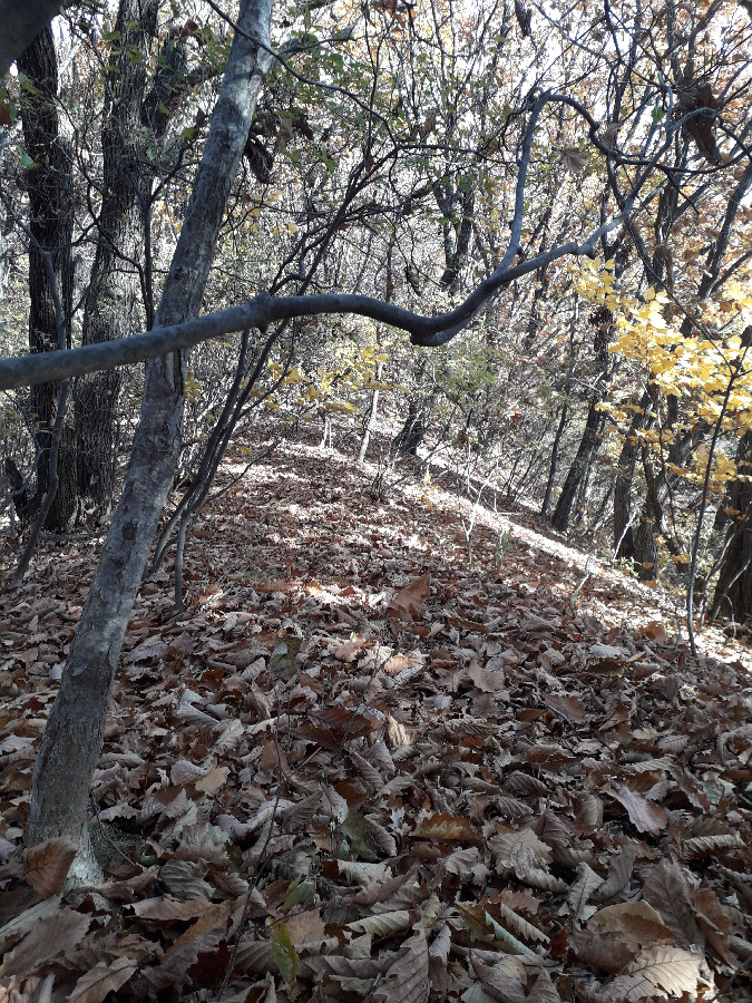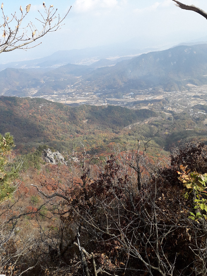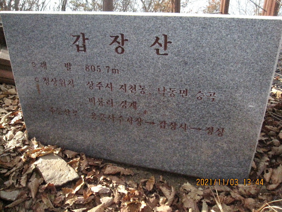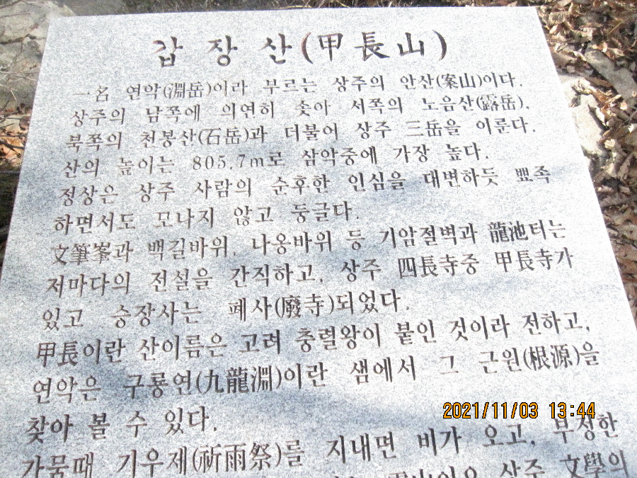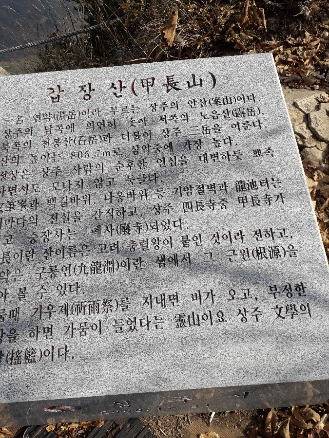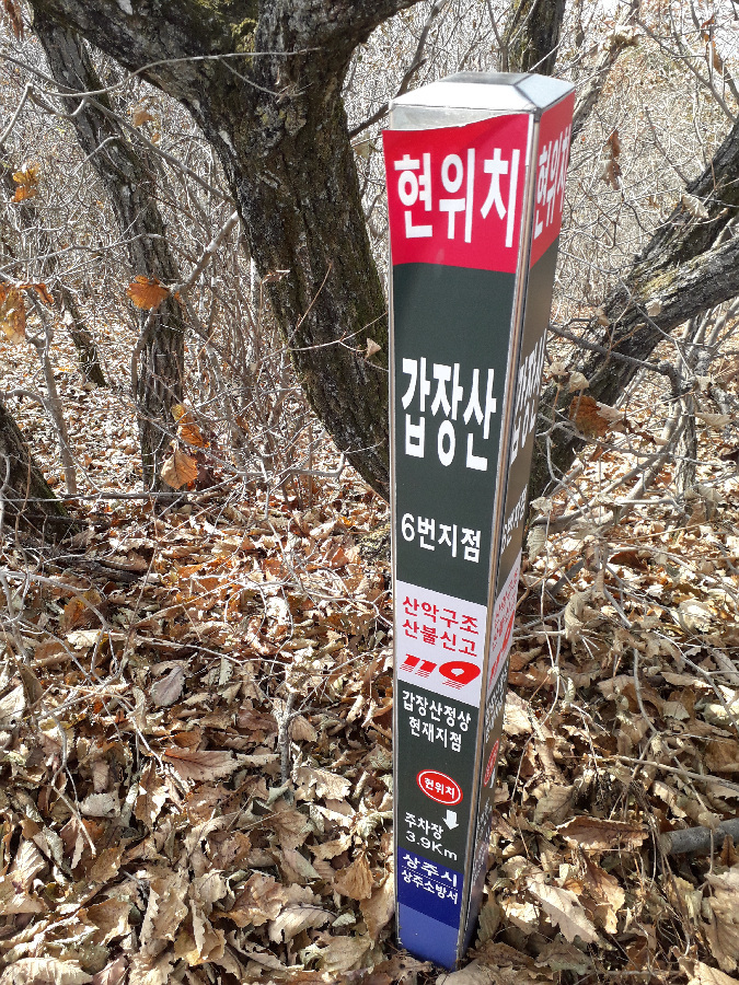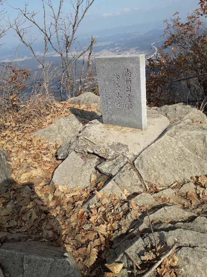 바위봉이 2-3곳 있어 피하여 빙도는 힘도는 코스라 난코스이다. 선답자의 리본도 없어 다소 빤빤한 등산로를 따라 오르기만 해야했다. 낙엽이 쌓여 쭈루룩 미끄리지기가 여러번이다. 낭떠러지가 자주 있어 등골이 오싹한 경우가 많았다. 8부능선에 오르니 2곳에 리본이 보여 조금 안도했다. 얼마나 힘들었는지 모자와 스탁한개를 잊고 말았다. 난코스를 이동하는 동안 너무힘들어 스틱을 언제 잃었는지도 몰랐다. 오르면서 119에 전화하는 장면이 생각나기도 할 정도로 힘들었다. 정신력으로 갑장산 정상에 간신히 도착했다. 보통 상주 시민들은 1년에 1-2번 갑장산에 오르는 경우가 대다수 인데 나는 근래 5번 정도 올랐다. 용포리-승곡리 사이에 있는 웅장한 540봉과 갑장산 사이 능선의 난코스를 언제한번 오를까 열망하고 고민했는데 오늘에야 완수했다. 나는 항상 오르던 곳으로 다시 내려오는 방법으로 원점회귀하는 방법의 등산인인데 오늘은 반대편으로 하산해서 차는 비룡리 잿마 마을에두고 귀가했다. 애마를 남의 동네 주차장에 두고 왔다. 오늘 너무 피곤하니 다음날 회수하려고 한다. 오래전 부터 916도로를 오고가면서 갑장산-540봉의 높은 능선으로 갑장산 등산을 하고싶었다. 이제야 나의 등산 숙제를 해결했다. 갑장산 정상에서 조망과 식사후에 갑장사 거쳐 시멘트 도로로 내려가 남부 초등까지 걸었다. 남부초등 옆 버스다니는 도로에 안착해 시내버스타고 귀가헀다.