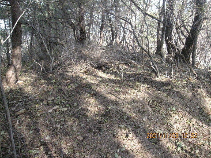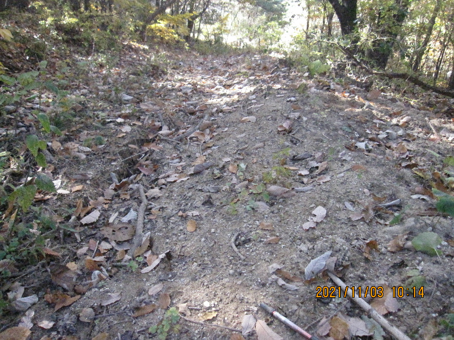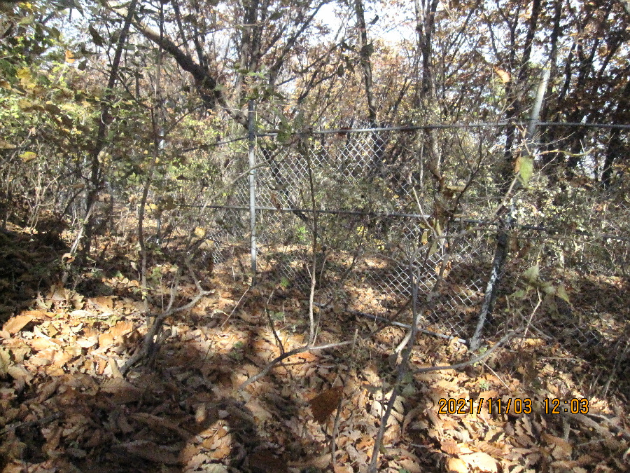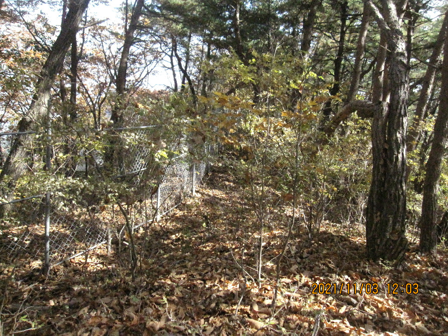 540봉에서 갑장산 방향 서쪽 능선을 내려가니 곧이어 철망이 등장한다. 개인 사유지라고 능선을 철망팬스가 점령하여 등산로는 철망 좌측아래 힘든 길의 새길로 잡목을 제쳐가며 오르내린다.