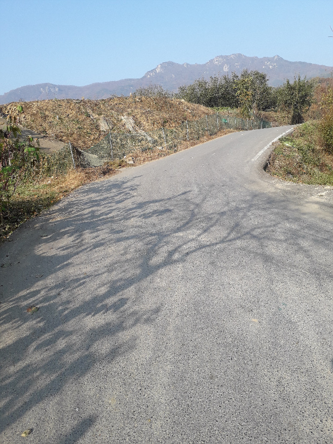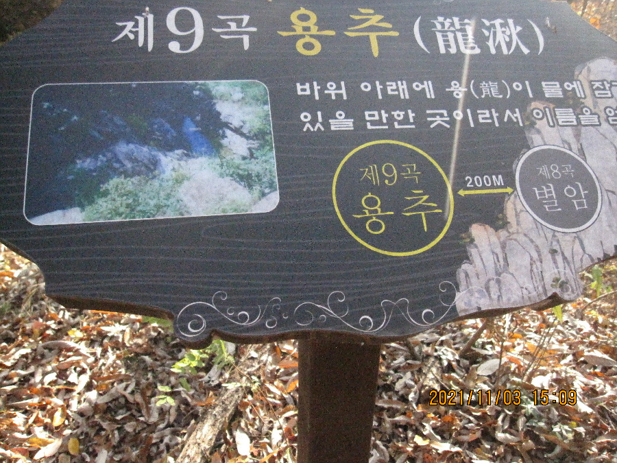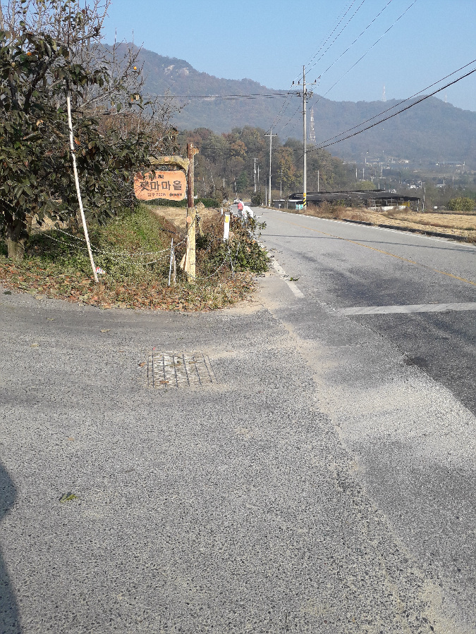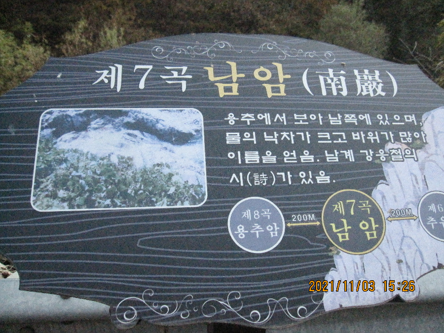 용흥사 입구 대주차장- 버스가 오후 4시 45분에 도착한다고 주민이 말해서 1시간 30분 기다리기 힘들어 걸어서 버스다니는 남부초등학교 앞까지 2키로 미터를 연악9곡 구경하며 내려갑니다.