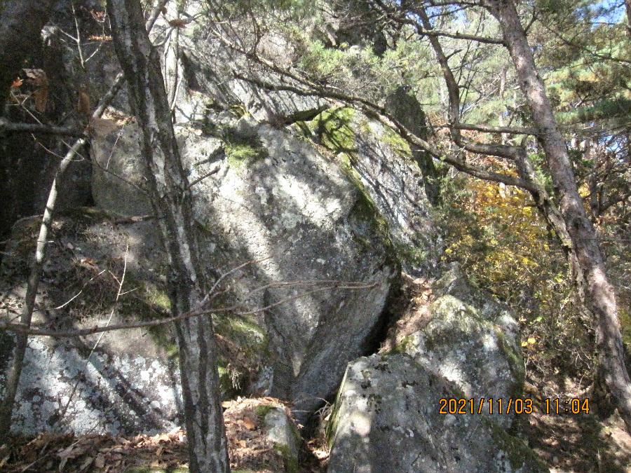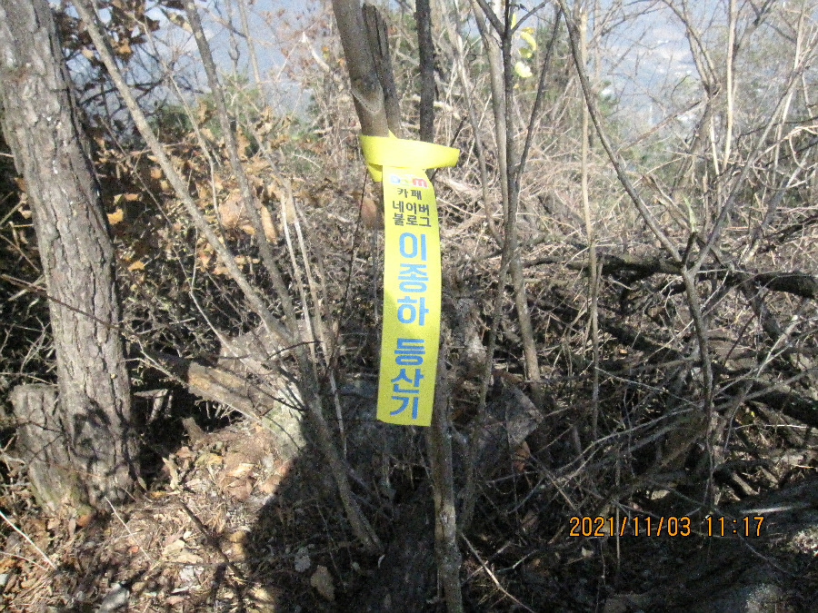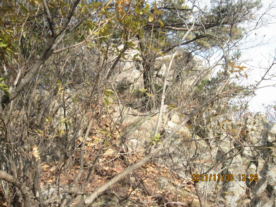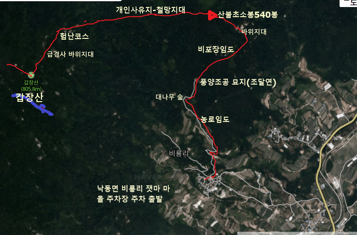 문장대 아종하는 11월 3일(수) 상주 낙동면 비룡리 잿마마을 주차장에 주차하고 출발했다. 임도따라가서 풍양조공 묘역을 통과하고 비포장 수레길 따라오르다가 다소 험한 바위지대를 지나540봉 산불초소봉을 4번째 답사하였다. 이어 힘을 내어 동서 능선으로 이어지는 난코스를 극복하고 갑장산을 답사했다. 몇년전에 이코스를 답사하려고 시도했으나 540봉까지만 답사하고 말았다. 당시는 540봉에 산불초소가 없었다. 당시 바위지대를 올라 힘들게 올랐으나 더이상의 길이 희미하여 포기했다. 지금 생각해보니 산불초소가 있는 540봉을 답사하고 말았다. 540봉에서 서쪽으로 이어지는 능선은 승곡리-비룡리 사이 안부를 지나 심한 급경사이고 바위지대가 많다. 그리고 개인 사유지라 철망으로 등산로를 막았다. 등산로는 철망 옆의 희미한 길이다. 이 코스는 중앙코스이지만 멀리서 봐도 힘들어 보이는 바위봉우리들이 있어 누구나 꺼리는 코스다. 그러나 갑장산에서 계단이 시작되는 곳에서 하산한다면 내리막이니 쉬어 보인다. 이코스는 가시잡목과 진달래 나무 등이 길에 꽉찬 등산로라 어딘지 몰라 포기하는 경우가 많다. 물론 배테랑 경험자들은 이코스를 가끔 답사하는 같다. 나는 여러가지로 불리한 조건을 가진 등산인이다. 하지만 용기를 내어 용포리 잿마에서 출발하고 540봉을 거쳐 안부지역에 설치한 개인 사유지 철조망을 따라 이동하였다. 능선을 이어가는 얼마간의 철망을 이별하고 능선을 계속 따라 올라 바위지대를 극복하였다.