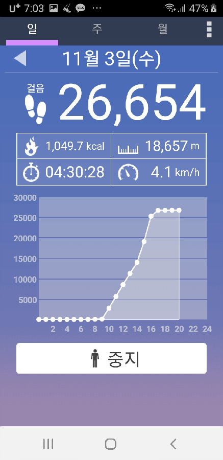 오늘 이동한 만보기 통계 - 10키로 미터 정도거리